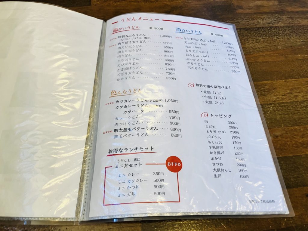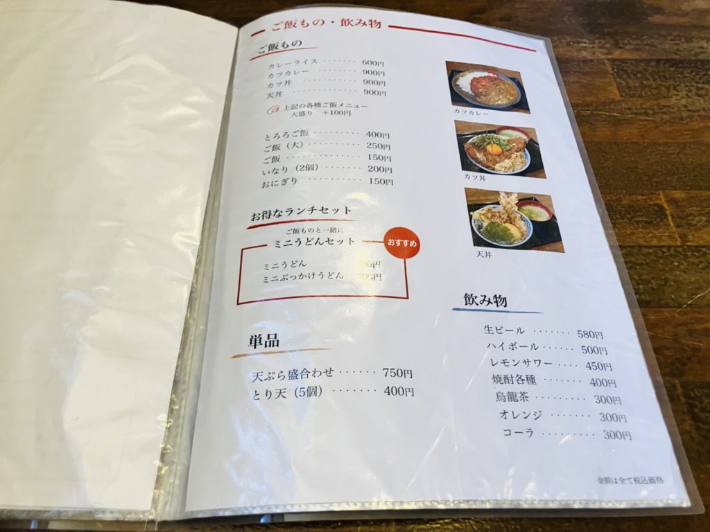 ランチはうどん屋、夜は炭火焼居酒屋でメニューが異なります。今回はランチのうどんメニューをご紹介します。ランチはうどんメインではありますが、天丼やカレーなどのご飯ものもあります。