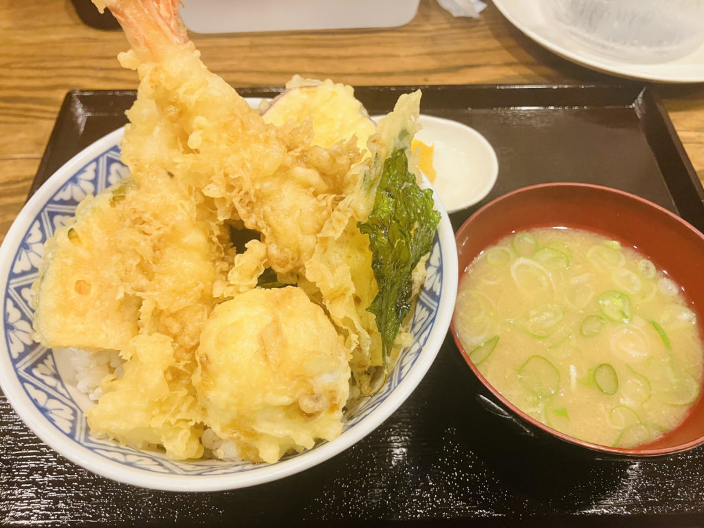天丼は大ぶりの海老天が2尾も入ったガッツリ仕様。サクサクの天ぷらで、食事がガツガツ進みます。