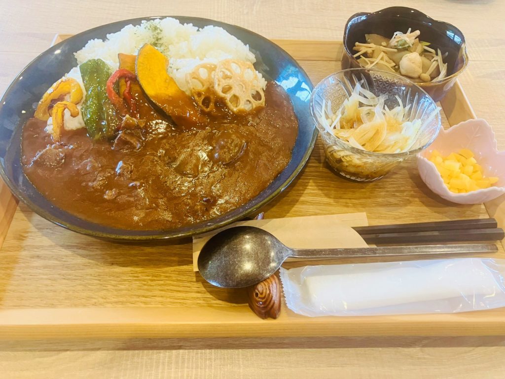 カレーと聞いていたので、最初はカレーだけが出てくるものかと思いきや、小鉢やお漬物などもついたカレーセットでボリュームがしっかりあります。