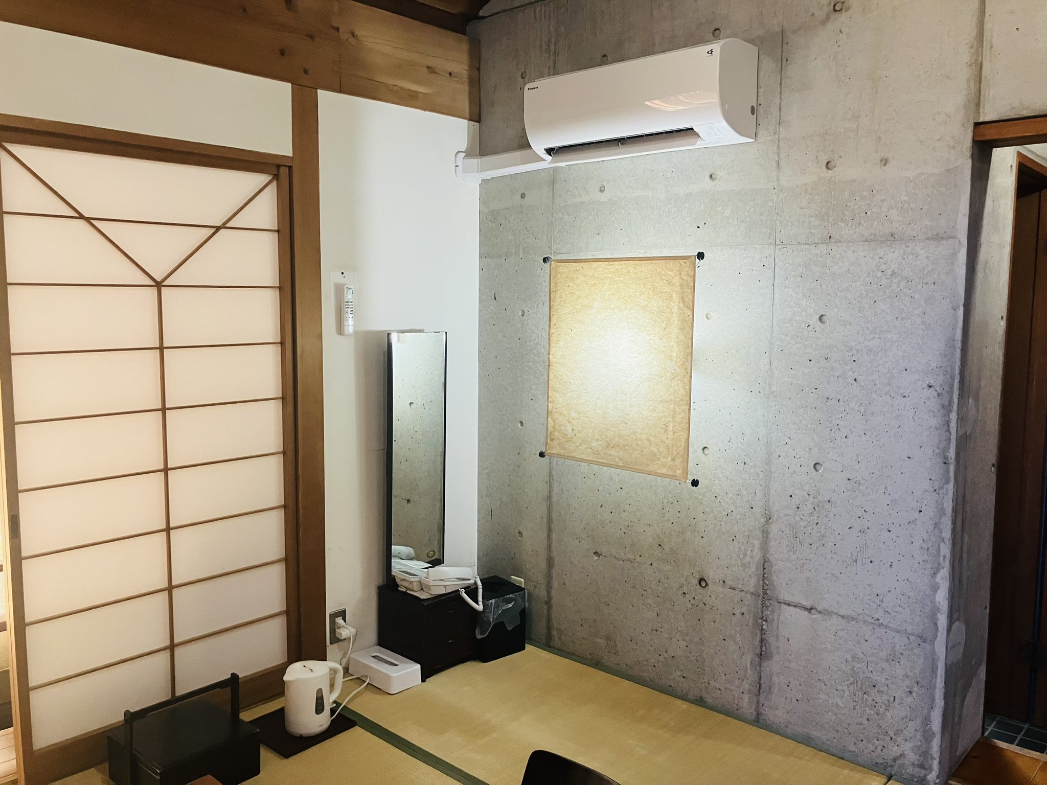 山江温泉ほたるの宿泊施設はコンクリート壁×和風のたたみといった和モダンな空間。