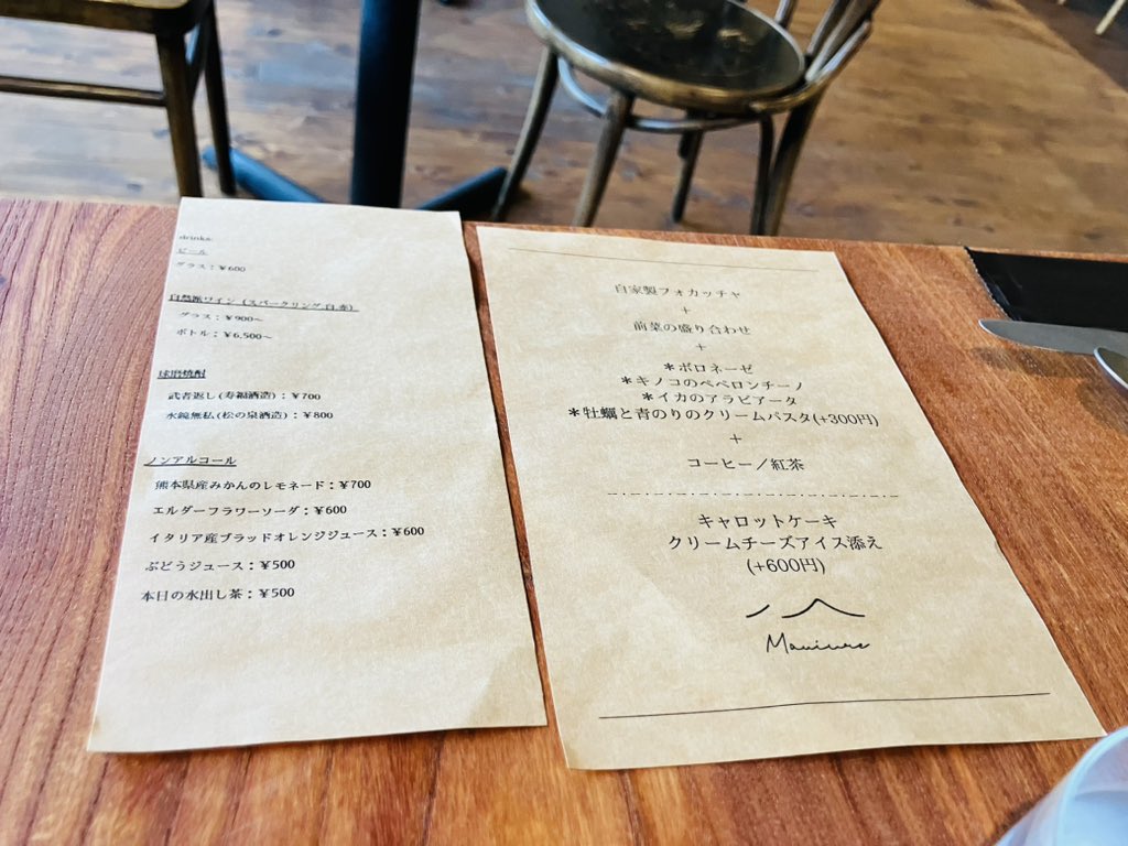 Mavivreのメニューはコース料理のみ。ランチは2,000円から、ディナーはコース料理 8皿で8000円 (+サービス料10%)とのことです。