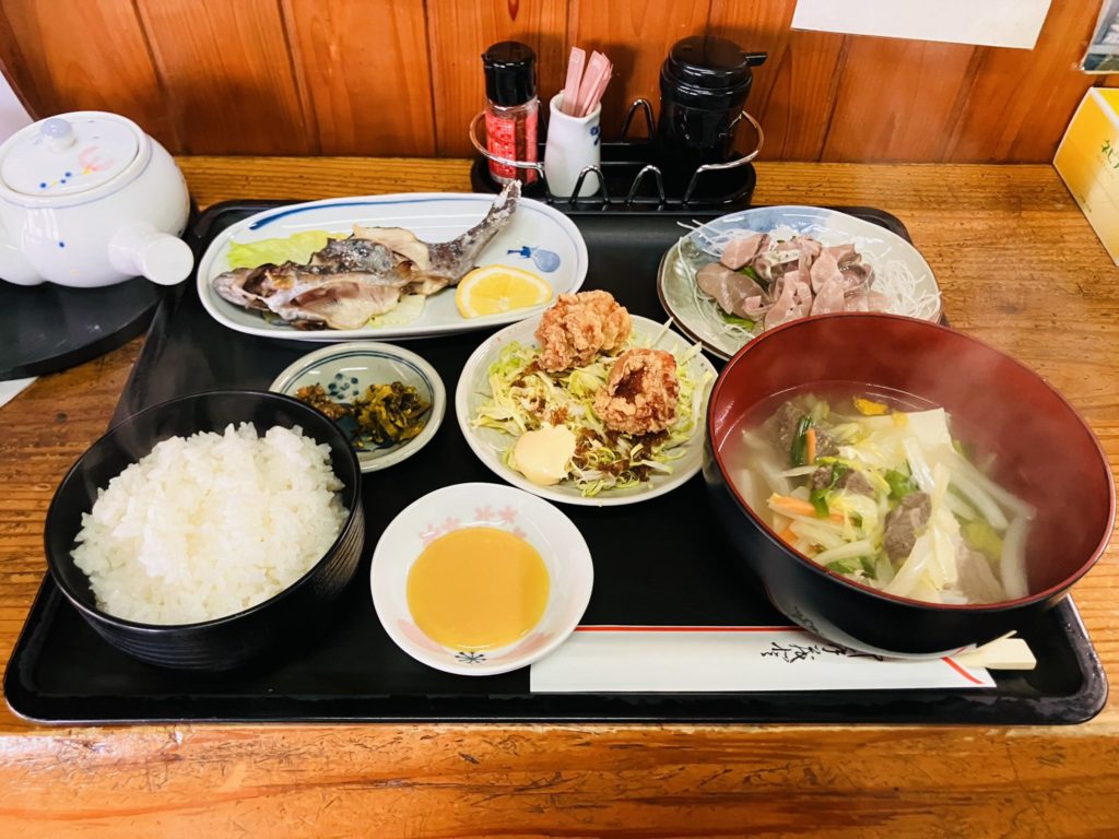 昼はランチ、夜は居酒屋として楽しめます。すべての定食に鯉汁(鯉こく)がついていて、これぞ人吉球磨といった印象 店の中ではおでんも炊かれており、特にタケノコのおでんはシャクッとほろほろ崩れて絶品なのでおすすめです。