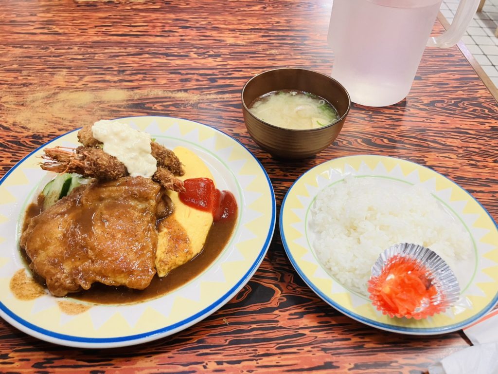 多良木の人気食事処。外観や名前からすると一見和食屋さんに見えますが、むしろオムライスなど洋食メニューが充実しているユニークなお店。Aランチはエビフライや魚フライ、オムレツにチキンソテーで1430円と破格で、特にオムレツのプルプル感が最高の美味しさです。
