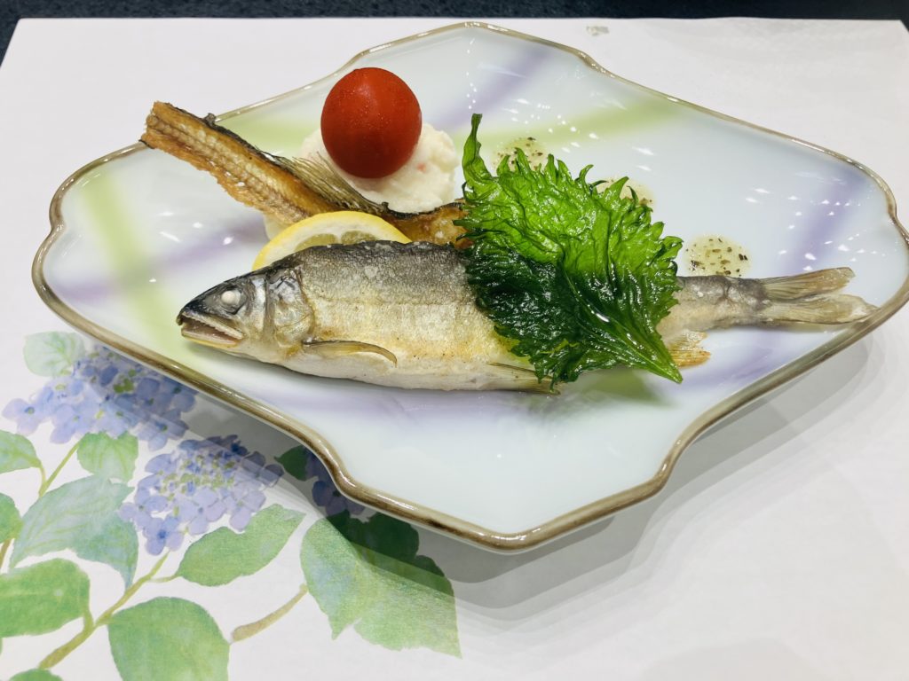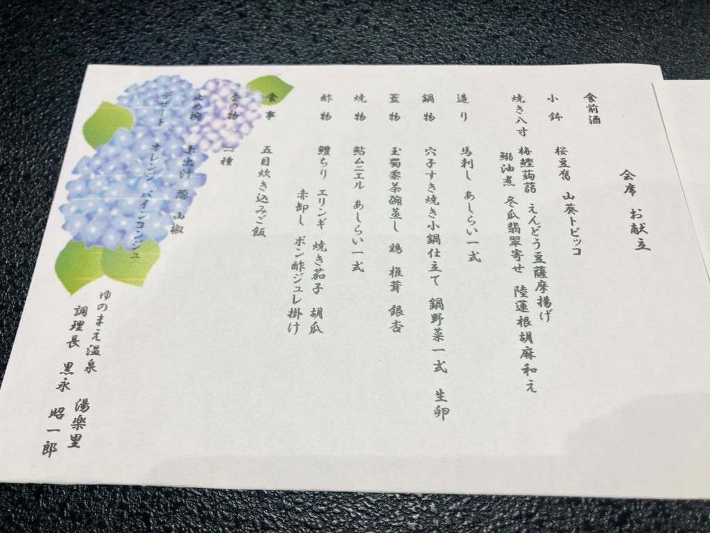献立表や食材はもちろん、小鉢の更にはアジサイの花びら(食べられません)が盛り付けてあったりと、細かいところで気遣いがされており、夕食はかなりコスパがいいです。